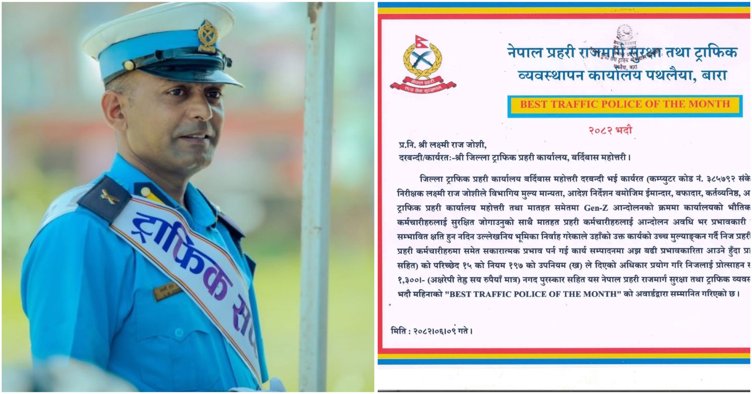 महोत्तरीका प्रहरी निरीक्षक जोशीलाई ‘बेष्ट ट्राफिक पुलिस अफ द मन्थ’ सम्मान