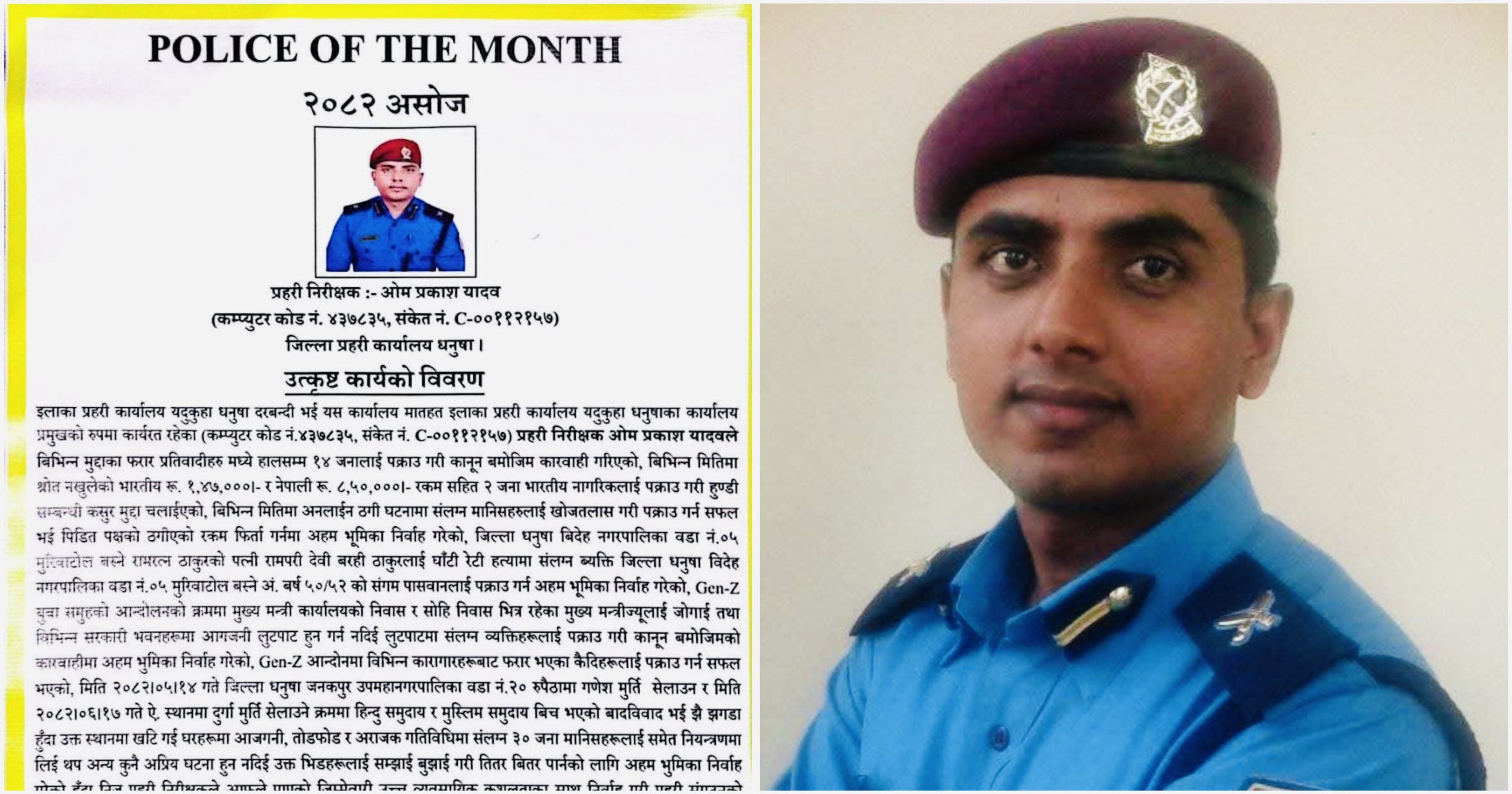 धनुषामा अपराध नियन्त्रणका नायक : प्रहरी निरीक्षक ओम प्रकाश यादव असोज महिनाका उत्कृष्ट प्रहरी