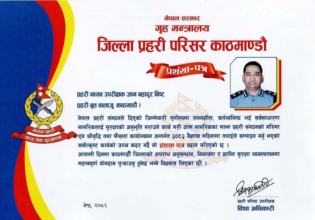 प्रहरी नायव उपरीक्षक ज्ञान बहादुर बिष्टलाई सर्वोत्कृष्ट कार्यका लागि प्रशंसा–पत्र