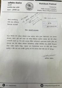 काठमाडौं । सार्वजनिक लेखा समितिका सभापति ऋषिकेश पोखरेलले ठगीमा संलग्नको आरोप लागेका स्वकीय सचिव अनिलकुमार पोखरेललाई हटाएका छन् । संघीय संसद् सचिवालयलाई पत्र लेखेर सभापति पोखरेलले स्वकीय सचिवलाई हटाएका हुन् । संसद् सचिवालयका प्रवक्ता एकराम गिरीका अनुसार सभापति पोखरेलले स्वकीय सचिवलाई हटाउनका लागि भन्दै शुक्रबार पत्र पठाएका छन् ।