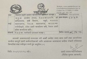 प्रहरी नायव महानिरीक्षक (डीआईजी) दिनेशकुमार आचार्यद्वारा हस्ताक्षरित पत्रमा उल्लेख छ, “हालको अवस्थालाई मध्यनजर गरी अर्को आदेश नभएसम्म त्यहाँ तथा अन्तर्गतमा कार्यरत सम्पूर्ण प्रहरी कर्मचारीको अति आवश्यक अवस्थामा बाहेक नोकरी राजीनामा सिफारिस तथा स्वीकृत नगर्न हुन अनुरोध छ।”