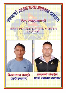 काठमाडौँ। काठमाडौँ उपत्यका अपराध अनुसन्धान कार्यालयका पिलर नं. ०८ वैदेशिक रोजगार ठगी सम्बन्धी अनुशन्धान शाखामा कार्यरत प्रहरी हवल्दार बिमल थापा मसाङ्गी र सहायक हवल्दार इन्द्रमणी पोखरेल भदौ महिनाकोपुलिस अफ दी मन्थघोषित भएका छन्।